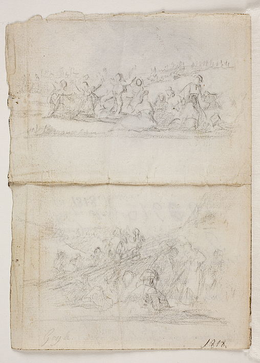 Las dos pequeñas composiciones del reverso suponen una verdadera novedad en los dibujos hasta ahora conocidos de Goya. La facilidad de las líneas, la fuerza expresiva y la gracia de las figurillas enlazan con las que a veces pueblan los fondos de algunos dibujos tardíos de Goya [ver por ejemplo el destruido Gran Coloso dormido, Álbum G 3, G I 367; el Gentío en un parque, Álbum F 31, G I 302; La pirámide, G II 334; El Montgolfier, G II 335, etcétera], en torno a la fecha de 1818 que suponemos para esta obra. Parecen en este caso escenas tomadas del natural. La de la parte superior refleja un eco de la juvenil Pradera de San Isidro del Museo del Prado, al presentar en un mismo fondo de paisaje, unas figuras sentadas, otras que bailan, como en una fiesta improvisada y popular. El tema del baile fascina también a Goya a lo largo de toda su vida y es aquí interesante, porque de esta pequeña obra parece tomar inspiración el artista para su expresivo dibujo, asimismo en el Prado, conocido como Disparate Alegre [D04376] y grabado en la serie de los Disparates. En él aparece un grupo de figuras femeninas y masculinas que bailan en corro, con los brazos en alto y enlazados, como el ligerísimo apunte del nuevo dibujo del Prado. El Disparate Alegre junto con los otros, se fecha entre 1815 y 1824, quizá más hacia el primero de estos años, por las posibles dataciones de alguno de los grabados de la serie.