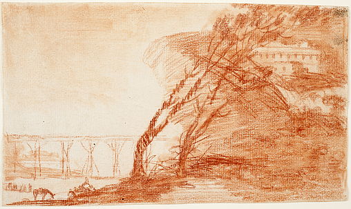 Dibujo preparatorio para el aguafuerte Paisaje con construcciones y árboles
