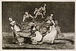 En 1877 la revista parisina L’Art publicó las cuatro estampas de los Disparates que separadas del resto de la serie habían permanecido inéditas. Estas cuatro estampas, a falta del conocimiento de las pruebas de taller en las que aparecía manuscrito un título, fueron tituladas por los editores como Lluvia de toros [Disparate de toritos], Otras leyes para el pueblo [Disparate de bestia], ¡Qué guerrero! [Disparate conocido] y Una reina del circo [Disparate puntual]. L’Art era una revista de periodicidad semanal, en la que además de artículos relacionados con el arte se publicaban estampas realizadas al aguafuerte. Editada desde 1875, la revista se encuadra en el gusto por la bibliofilia existente en el París del momento, así como en la renovación del aguafuerte a cargo de pintores-grabadores que buscaban en esta técnica la vía para la creación de estampas originales, al margen del grabado académico de reproducción. Ambos hechos dieron lugar a obras de extraordinaria calidad, en las que se valoraba tanto la creación original como la bondad material de las estampas, cuidándose la elección de los papeles y las tintas. Todo ello unido al gusto de los bibliófilos por lo exclusivo, hicieron que además de la edición corriente que incluía cada una de las estampas con título y referencia de autorías, estampadas en tinta de color negro sobre papel verjurado de tono ahuesado, se realizasen de cada uno de los números de la revista cinco ejemplares en los que junto a la estampa con las características descritas anteriormente, se incluían tres variaciones realizadas a partir de cada cobre y previamente al grabado de la letra. Así cada uno de estos cinco ejemplares contenía las siguientes estampas obtenidas a partir de un mismo cobre: la primera sobre papel verjurado de tono ahuesado con tinta de color negro, incluyendo letra con autoría y título; la segunda sobre papel avitelado con tinta de color siena natural; la tercera también antes de letra sobre papel japonés verjurado con tinta de color negro; y finalmente la cuarta, también antes de letra, sobre vitela con tinta de color negro. Mientras que las tres primeras estaban encuadernadas con escartivanas, la última, por su material de mayor nobleza aparecía intercalada sin encuadernar entre las páginas del texto. Estas estampas deben valorarse, además de por ser obras de Goya, como producto y documento de la estética dominante en el último cuarto del siglo XIX, en unos tiempos en los que la “manipulación” de la obra de arte era perfectamente legítima y aportaba la visión que de la obra del artista había en ese momento. Caracteriza la edición una refinada impresión en la que se cuidaba al máximo el proceso de estampación: biseles limpios, elección de la tinta adecuada a cada papel, y búsqueda de aquellos papeles que permitiesen un mayor goce estético. De este modo se combinan los tonos del papel, el color de la tinta así como la mayor o menor limpieza de la lámina, buscando obtener una estampa de extraordinaria calidad. Además del papel verjurado, se escogieron papeles de excelente calidad, como el avitelado de J. Whatman Turkey Mill, habitualmente utilizado para la edición de lujo; el japonés verjurado, cuya delicada transparencia convierten la estampa en un objeto frágil y exquisito; y por último la vitela, soporte tradicionalmente asociado a la edición de lujo y que nos acerca a las estampas de los grandes maestros del Renacimiento y el Barroco. Puede resultar paradójico, pero estos divertimentos estéticos que “manipulan” la obra de Goya, se aproximan bastante más a lo que éste buscó que la edición que la Academia realizó en 1864 con las dieciocho láminas restantes, pues se realizó un tipo de estampación próxima a la natural, retirando la casi totalidad de la tinta sobrante, y poniendo así de manifiesto el valor simbólico que para Goya tenía el blanco en las estampas y que es posible rastrear en todas sus series anteriores.