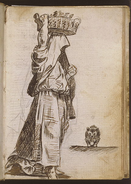 Goya se preparaba en Italia para ser un pintor de historia, para dominar la composición y las figuras, los mantos y túnicas de los personajes bíblicos y de la Roma antigua, pero breves detalles de una inequívoca modernidad aparecen en las escenas del Cuaderno: como el gato en lo alto de una tapia, la enorme cabeza de asno entrando por una ventana, asustando a dos asombrados personajes, la enigmática figura envuelta en el manto de la cabeza a los pies, la monstruosa cabeza masculina, de cuya boca fluye un río de agua o de sangre.